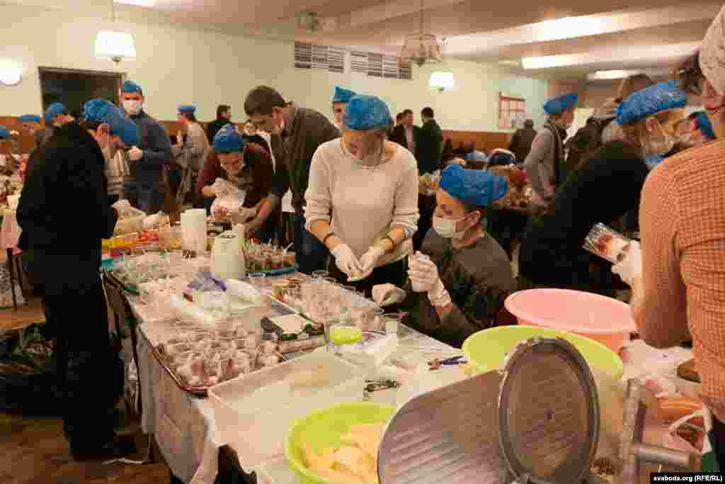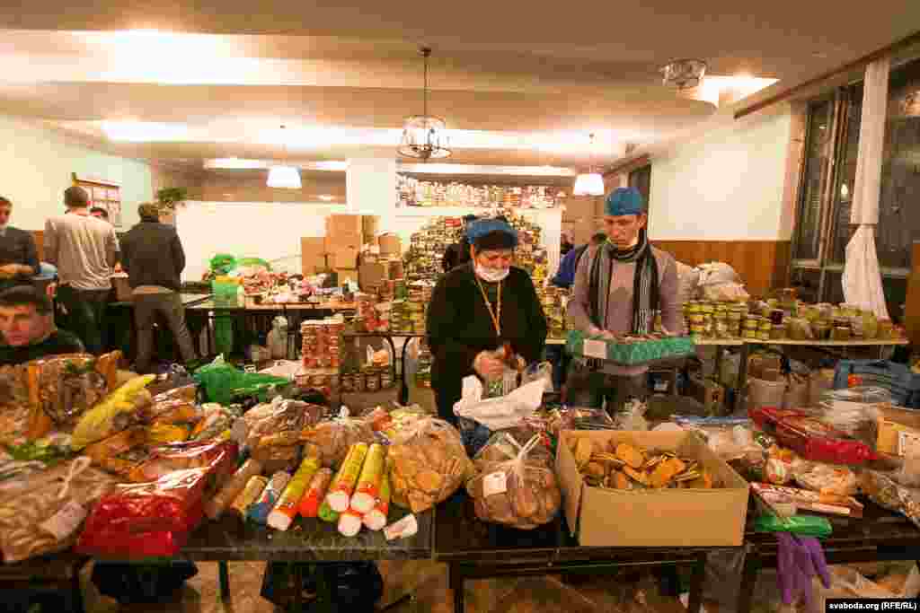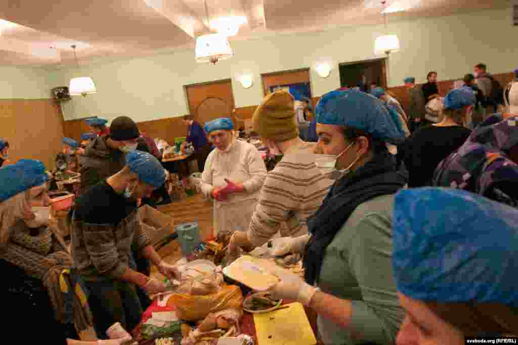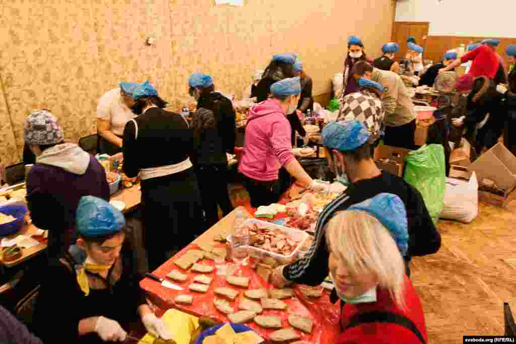 Для забезпечення харчуванням учасників Еврамайдану в будівлі Профспілок працює кухня. Тут працюють волонтери. Одні готують, інші роблять каву і чай, треті розносять їжу. Заради збереження санітарних умов на кухню не так легко потрапити.
