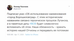 «Указ про перейменування один в один просто скопійований з указу Волгоградської міської думи про перейменування на 9 травня, День скорботи і вшанування пам’яті 22 червня і на день Сталінградської битви 2 лютого перейменування Волгограду на Сталінград. Теж саме зроблено один в один у рамках формування «луганського народу», – пояснює історик Валерій Снєгірьов.