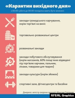 Кабінет міністрів оголосив анонсований раніше «карантин вихідного дня». Згідно з ним, по вихідних відтепер діятимуть суворі обмеження. Таким чином урядовці сподіваються обмежити поширення коронавірусної хвороби в час, коли кількість нових хворих на COVID-19, виявлених за добу, може перевищувати 10 тисяч. Радіо Свобода пояснює, що саме тепер не вийде зробити на вихідних і чи допоможе це знизити навантаження на лікарні.