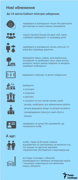 До 24 квітня в Україні заборонено з’являтися у громадських місцях без маски чи респіратора на обличчі, ходити групами більше двох людей, а діти до 14 років повинні бути в супроводі дорослих – такі обмеження уряд затвердив 2 квітня. Відповідна постанова з’явилася на сайті уряду 3 квітня.