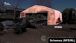 Журналісти звернули увагу на один з кадрів із російського відео, на якому ведуть полоненого. Ліворуч видно два КамАЗи, білий і зелений із літерами V. Позаду – будівля з напівзруйнованим дахом, праворуч від неї – прямокутний білий намет. Ті ж об’єкти помітили і з іншого ракурсу: ті самі два КамАЗи, той самий напівзруйнований дах.