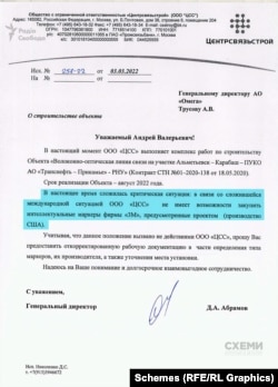 Натомість, як випливає із листування, у одного із підрядників великого будівництва мережі зв’язку «Центрсвязьстрой» у зв’язку із запровадження санкцій виникли проблеми, пов’язані із комплектуючими, які компанія раніше купувала у Сполучених Штатах.